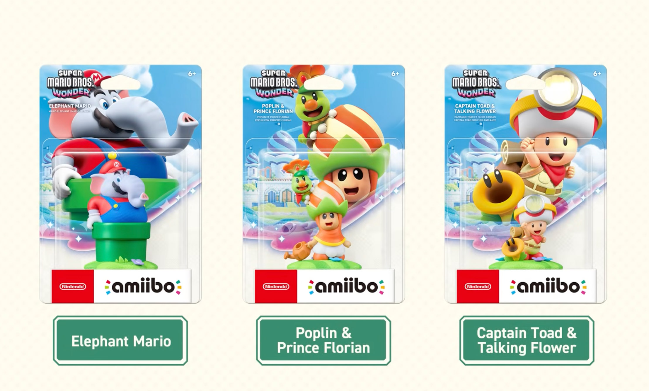 Ese mismo día salen 3 nuevos amiibo: Mario elefantito, Capitán Toad con Flor Parlante y Poplin con Príncipe Florian.